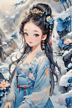 (Premium), (Premium), (Ultra fine), Ultra fine CG, (Illustrated), (Fine Light), (Extremely delicate and beautiful), Girl, Solo, (Upper Body), (Cute Face), expressionless, (Beautiful Fine Eyes), Hanfu, (Mid Breast 1.2), Blue Eyes, (Vertical Pupils 1.2), White Hair, Bright Hair, Colorful Inner Hair, [Armordress], Blue Air Accessories, Ice Hair, Depth of Field, [Ice Crystal], (Snowflake)