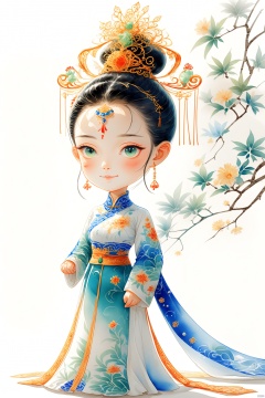 水彩风格,中国水墨,张大千风格,炫彩,多彩,远景,一个人,正面照,面对观众,全身照,黑色头发的中国女孩,漂亮,可爱,眉清目秀,目光清澈,精美头饰,黄金,玉石,珠宝,微笑,性感身材,大胸,完整精美的5根手指,现代长裙,大长腿,高跟鞋,白皙皮肤,纯色干净背景