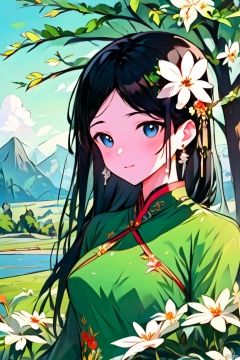 1girl, solo, long hair, breasts, looking at viewer, blush, bangs, blue eyes, black hair, hair ornament, long sleeves, dress, jewelry, upper body, flower, earrings, outdoors, parted lips, sky, day, cloud, hair flower, tree, parted bangs, watermark, chinese clothes, floral print, white flower, tassel, green dress, mountain