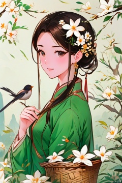 1girl, solo, long hair, simple background, brown hair, hair ornament, long sleeves, full body, flower, hair flower, chinese clothes, white flower, bird, green dress, holding basket, hanfu, negative_hand