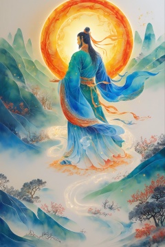 盘古开天地,中国神话传说,超现实主义绘画,纸本淡彩,现代发光水墨,无瑕疵,无损画质,大师之作,高清