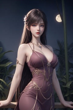 1girl, aurora, bamboo, bangs, bare shoulders, blue eyes, branch, breasts, city lights, cleavage, cloud, constellation, crescent moon, dress, fireflies, flower, full moon, gem, hair flower, hair ornament, jewelry, large breasts, leaf, light particles, lips, long hair, looking at viewer, milky way, moon, moonlight, night, night sky, outdoors, palm tree, pink lips, plant, shooting star, sky, solo, space, star \(sky\), starry sky, tanabata, tanzaku, tree, very long hair  <lora:彩儿:0.66>