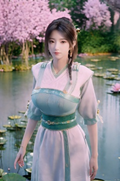 masterpiece,(best quality),(makeup),official art, extremely detailed cg 8k wallpaper,((crystalstexture skin)), (extremely delicate and beautiful),(highly detailed),(1girl), (solo), (jewelry), (earrings),(long_hair),(black_hair),(hair_ornament),(handwear),(breasts),(standing),(braided_hair:1.000),,(upper_body),((dress,skirt)),(multicolored_clothes),(multicolored_dress),(chinese_clothes),(adapted_costume),((closed_mouth)),(sleeves),,(sunshine, outdoor),((looking_at_viewer)),((Facing the camera)),Xzhouxiaohuan,(big breasts:1.89),,(A pond full of pink lotus flowers:1.5),Xjitanyin