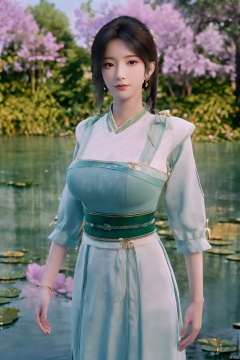 masterpiece,(best quality),(makeup),official art, extremely detailed cg 8k wallpaper,((crystalstexture skin)), (extremely delicate and beautiful),(highly detailed),(1girl), (solo), (jewelry), (earrings),(long_hair),(black_hair),(hair_ornament),(handwear),(breasts),(standing),(braided_hair:1.000),,(upper_body),((dress,skirt)),(multicolored_clothes),(multicolored_dress),(chinese_clothes),(adapted_costume),((closed_mouth)),(sleeves),,(sunshine, outdoor),((looking_at_viewer)),((Facing the camera)),Xzhouxiaohuan,(big breasts:1.89),,(A pond full of lotus flowers:1.5),Xjitanyin