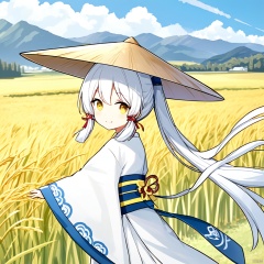 bm tol,ask \(askzy\),(mountain han:2),kidmo,applepie \(12711019\),minimalism,close-up,looking at viewer,1girl,solo,eyeshadow,crossed bangs,ahoge,very long hair,yellow eyes,curly hair,(white hair:1.5),pensive,sad smile,pointy ears,White dense eyelashes,Exquisite clothing,white Chinese clothes,(white hanfu:1.1),yellow belt,sleeves past fingers,yellow Marginal decoration,white long boots,wheat field,mountain,