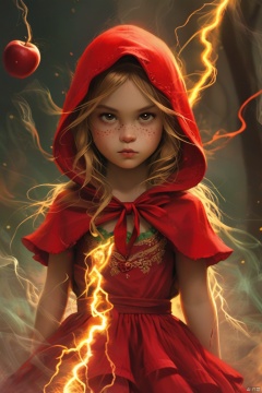 邪恶小女孩小红帽,红色的连衣裙,红色连衣帽子,闪电,火焰,烟雾,彩色长裙,森林,红色和绿色各一半的苹果