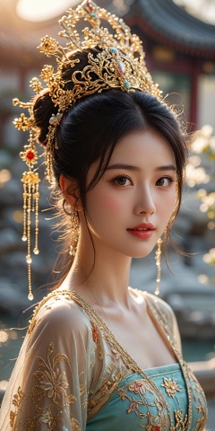 exmasterpiece,best_quality,ultra_detailed,photorealistic,cinematic_lighting,realistic,bokeh,high-end fashion photoshoot,a beautiful chinese girl,leogirl,young,collarbone,(((cleavage))),large breasts,aqua eyes,seductive smile,upper_body shot,hanfu,real skin texture,