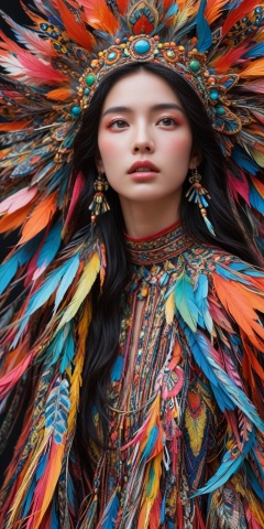 Fashion photography portrait, close up portrait, (1girl, clear face:1, is with Colorful feathers on her neck, surrounded by Colorful feathers, black long hair, wear colorful Colorful feathers coat and outfit fashion costume with ruffled layers:1)