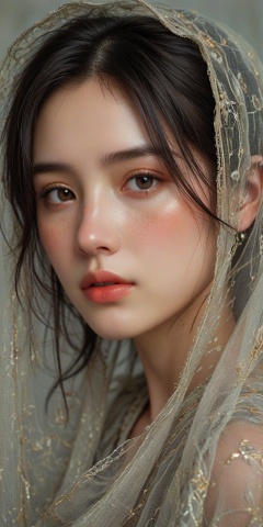 The image showcases a close-up portrait of a young woman with an ethereal appearance. She possesses long,dark hair that cascades down her shoulders and is adorned with what seems to be a sheer scarf or veil blending into the background. Her complexion is impeccable,complemented by subtle makeup featuring earthy tones on her eyelids and a soft peach hue on her lips. She rests her face gently in her hand,exuding serenity and poise.,