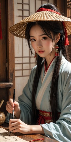 scroll,solo,hat,1girl,paintbrush,calligraphy brush,writing,inkwell,holding,looking down,indoors,realistic,black hair,long sleeves,blurry,lips,upper body,half-closed eyes,book,closed eyes,closed mouth,table,chinese clothes,short hair,HDR,UHD,8K,best quality,masterpiece,Highly detailed,Studio lighting,ultra-fine painting,sharp focus,physically-based rendering,extreme detail description,Professional,masterpiece,best quality,delicate,beautiful,