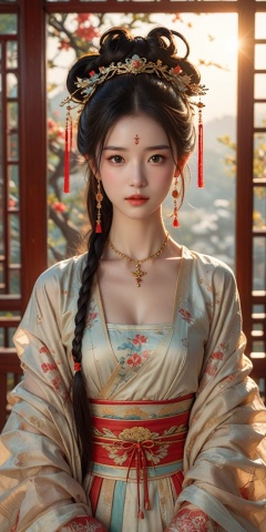 dynamic poses, stunning colors, 3D rendering masterpiece,high resolution,1girl, (hair ribbon, headband, side braid),hanfu, Chinese Traditional cloth,ultra-detailed, (high detailed skin),glossy skin, female focus, model, ,chinese ink painting style, ,Wearing clothes with Chinese elements,(chinese style:1.2),extreme detailed,gufeng, gradient, fractal art, colorful, highest detailed hair,HDR,8kresolution,1girl,earrings,jewelry,breasts,solo chest pleated skirt, ,long_hair,makeup,jewelry,eyeshadow, braid, looking at viewer, bangs, breast curtain,long sleeves,ribbon, tassel ,scenery,chinese architecture, trees, birds, sun,outdoors,depth of field,