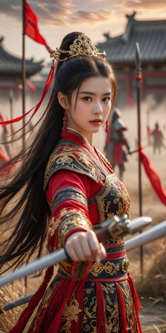 1girl,moyou, Ancient Armor, red Chinese_armor, a 20 year old chinese girl, Qinjia, cinematic photo Female general, 35mm photograph, film, bokeh, professional, 4k, highly detailed,Armor and weaponry, Fierce expression, Long flowing hair, Battlefield backdrop, Cloudy sky, Warrior stance, Deep red dress, Golden armor, Sword in hand,Fighting wounds, Ruined outfit, Damaged attire, Bleeding fabric, Realistic,Masterpiece, the best quality, perfect official art, (Masterpiece :1.3), the best quality, girls, delicate beautiful face, delicate beautiful features, high cold, long hair, national wind, horn, belt, hair accessories, piercing eyes,