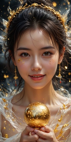 (close up portrait of 1girl, smile and eyes look down),solo,holding magic ball in hand,Black and gold watercolor,cloud,super wide angle,chinese,masterpiece,best shadow,Splash ink,high contrast,best illumination,cinematic light,chinese mythology,colorful,hyper detail,dramatic light,intricate details,dynamic angle,ink splatter,swirling black light around the character,black light particles,crack,depth of field,best quality,