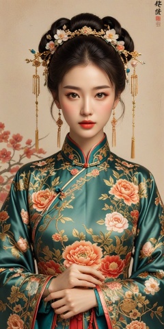 Traditional Chinese female portrait,delicate facial features,youthful woman,intricate hair adorned with floral accessories,rosy cheeks,slender neck,wearing an ornate qipao with elaborate embroidery,vibrant warm hues,cultural attire signifying elegance and status,serene and graceful demeanor,adorned with understated drop earrings,clear attention to textile patterns and jewelry details,soft pastel background complementing the subject's gentle visage,artistic inspiration likely drawn from historical Chinese paintings or modern reinterpretations thereof.,