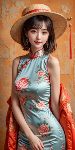 穿中国丝绸旗袍,1girl,AiARTiST,bare shoulder,by miv4t style, by fuzichoco style, reverse:1999, regulus \(reverse:1999\), 1girl, :d, blue dress, blue neckerchief, brown hair, cabbie hat, dress, hand up, hat, jacket, long sleeves, neckerchief, orange eyes, polka dot neckerchief, portrait, puffy long sleeves, puffy sleeves, red background, red jacket, short hair, smile, solo, sparkle, sunglasses, unworn eyewear, absurdres, highres, blurry background, newest, sensitive,best quality,masterpieces