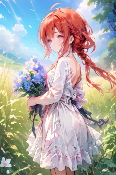 upper body,Create an image of an anime girl with bright red hair,wearing a sundress and holding a bouquet of wildflowers,standing in a field of tall grass with a soft breeze blowing through. The scene should capture the whimsical and carefree style of Sakimichan,with a sense of peace and tranquility in the air.,