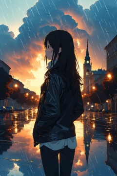 masterpiece,best quality,(ray tracing, cinematic lighting),ex-light,(central composition, Centered Composition and Symmetry:0.6),(back to camera:1.3),backlight,1girl,((solo)),black long hair,messy hair,jacket,pantyhose,rainy day,Cumulonimbus Cloud,(put hands in pockets),(outdoors, rain, sky, deserted streets, watered-down pavements, crossroad, fork in the road),tall buildings,bell towers,glass,reflections,streetlights,sunset,Tyndall Effect,