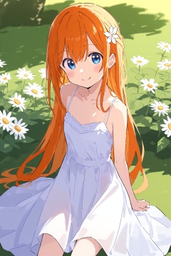 1girl, solo, long hair, blue eyes, dress, sitting,purple hair, white dress, looking at viewer, blush, smile, sleeveless, sleeveless dress, closed mouth, bare shoulders, very long hair, bangs, plant, bare arms, outdoors, sundress, hair flaps, feet out of frame, collarbone, flower, loli, petite, light orange hair, flower field