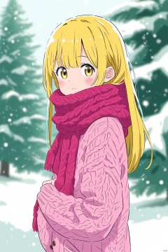 (masterpiece),(best quality),1girl, loli, solo, pink hair, long hair, yellow eyes, wearing pink knitted sweater, white collar poking out, red scarf wrapped around neck, rosy cheeks from cold, standing outdoors in winter scene, snowing lightly, snowflakes in hair, pine trees dusted white behind, looking ahead, cropped close-up composition, focus on face and upper body, intricate sweater details, photorealistic knit textures, vivid expression, hands in sweater pockets, (masterpiece quality illustration), (intricately detailed)