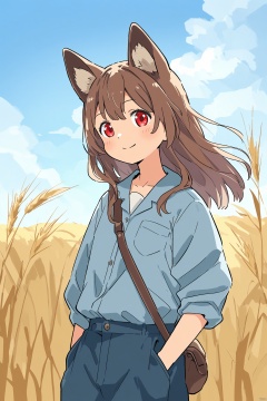 1girl, holo, animal_ears, long_hair, solo, brown_hair, wolf_ears, outdoors, sky, red_eyes, letterboxed, field, wheat, fang, looking_at_viewer, wolf_girl, cloud, day, smile, hand_in_own_hair, vest, blue_sky, shirt, blush, pouch