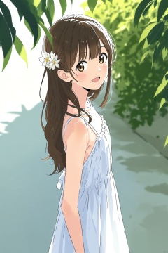 best quality, amazing quality, very aesthetic,1girl, dress, long hair, bird, white dress, brown hair, solo, outdoors, brown eyes, sleeveless, looking at viewer, arms behind back, sleeveless dress, bangs, standing, plant, sundress, smile, flower, closed mouth, sunlight, bare shoulders