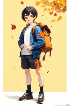 1boy, solo, looking at viewer, smile, short hair, bangs, shirt, black hair, long sleeves, brown eyes, standing, jacket, full body, white shirt, shoes, shorts, socks, bag, black footwear, leaf, watermark, black shorts, backpack, blue jacket, black socks, sneakers, hand in pocket, autumn leaves, ginkgo leaf