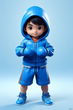 A boxing boy in a blue sports suit, a blue hood, in the style of 8k 3d, detailed character design, clean background, solid color background, can see the whole content, no cutting, full body, add detail, Panorama, positive perspective,