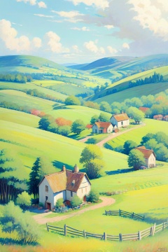 An idyllic countryside vista with undulating hills and quaint farmhouses, in the style of poster art, hyper-detailed, richly colored skies, colorful, Oil painting, cozy animation scenes, illustration