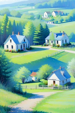 charming country house, blue siding, situated, side, road, surrounded, lush green grass, trees, background, creating, idyllic countryside setting, small fence, seen near, rustic charm, main house, two smaller houses visible, further down, road, one closer, left edge, scene, another towards, right, homes contribute, overall picturesque landscape, rural area