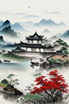 Chinese archway, full moon, (light and elegant colors in the picture), Chinese classical architecture, red crowned crane, overlooking mountains from afar, high-rise building, (white background: 1.1), ink painting, foreground of osmanthus tree, distant lake, riverbank with some rockeries and stones, red maple trees, and small boats on the river surface,
