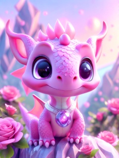 A cute, surprised pink dragon with big eyes, a big head, and a small body with small paws, wearing a hat and a silver pendant with a luminous pink stone. Set in daylight with soft pink roses, 3D render, natural lighting, and a detailed futuristic landscape background.