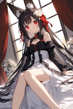 parameters1girl, solo, long_hair, hair_ornament, dutch_angle, white_hair, animal_ears, sitting, long_sleeves, red_eyes, flower, hair_flower, window, watermark, black_hair, dress, detached_sleeves, curtains, feet_out_of_frame, multicolored_hair