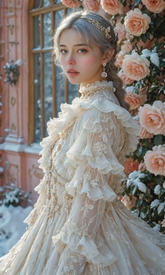(best quality, 8k, 32k, masterpiece, ultra high definition:1.2),beautiful big eyes, round eyes, pretty face,long, straight hair, from the front, best quality, ((actual)), high quality, Super detailed, ((real picture)), side light, ((Detailed face), shining eyes, looking at the audience, Beautifully,high quality, rich and colorful, (photography, photoactual:1.1), (perfect face:1.4), very long hair, silver hair, white hairband, crystal earrings, perfect face, pretty face, perfect eyes, very long hair, oil painting style, detailed Artwork, Art:, antique, Gorgeous tiara crown, very beautiful victorian princess, 19th century, Front view, Cowboy Xiao, white hair, wearing a big collar, Big ruffle collar, Detached sleeves, long sleeves, decorate, white corset, intricate fabrics, soft light, very detailed eyes, masterpiece, best quality,Close-up from waist up, winter, Snowing day, outdoor, baroque church
