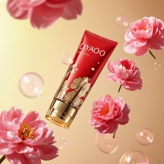 一款名为“CIYAOO”的化妆品产品,其包装为红色和金色的设计,上面有花卉图案。产品旁边漂浮着粉色花朵和气泡,背景是渐变色。