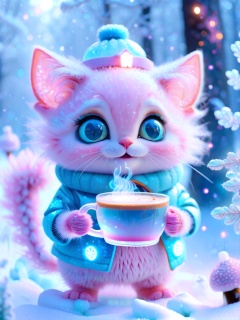 National Geographic-style photo of a tiny pink furry Cheshire Cat in glass epoxy, wearing a blue knitted scarf and warm hat, holding a steaming coffee cup. Winter backdrop, transparent body with glistening bioluminescent scales, snowflakes on iridescent skin, big expressive eyes, fairytale ambiance.