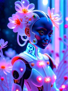 tiny neon glass filaments, Android, geisha, with robotic parts, in flowery kimono, Intricate details, 8k, cinematic, subsurface scattering
