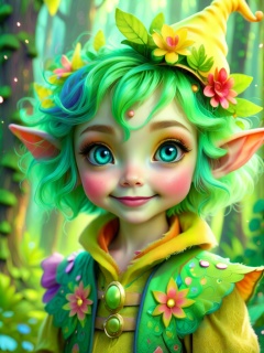 A detailed, whimsical portrait of a small elf-like character with large, expressive blue eyes, short curly green hair, and rosy cheeks. The character wears a vibrant outfit with a yellow hat adorned with colorful flowers, a ruffled collar, and a green and orange vest with intricate patterns. The background is softly blurred, giving a magical, forest-like atmosphere.