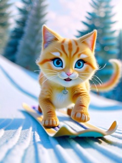 an image of an orange cat riding a snowboard on a snow covered hill with trees in the background, looking at viewer, blue eyes, full body, outdoors, sky, day, blurry, tree, no humans, blurry background, depth of field, cat, snow, realistic, animal focus