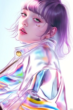 Best quality,masterpiece,transparent color PVC clothing,transparent color vinyl clothing,prismatic,holographic,chromatic aberration,fashion illustration,masterpiece,girl with harajuku fashion,looking at viewer,8k,ultra detailed,pixiv,
