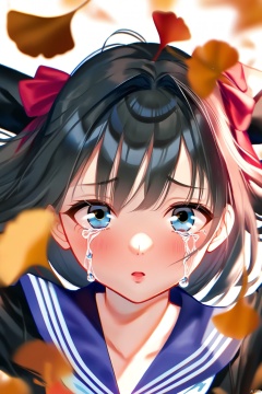 (masterpiece),(best quality),illustration,ultra detailed,hdr,Depth of field,(colorful),1girl,solo,school uniform,skirt,scarf,lying,serafuku,on back,long sleeves,autumn,blue skirt,looking at viewer,sailor collar,bow,brown eyes,long hair,tears,autumn leaves,bangs,blue sailor collar,shirt,parted lips,pleated skirt,white shirt,envelope,ahoge,blurry,red scarf,black hair,crying,leaf,letter,crying with eyes open,yellow bow,outdoors,brown hair,bowtie,ginkgo leaf,from above,tearing up,blush,