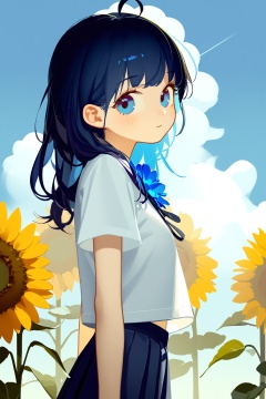 (masterpiece),(best quality),illustration,ultra detailed,hdr,Depth of field,(colorful),artist:chenbin,artist:tianliang duohe fangdongye,[[artist:wlop]],Artist:ask (askzy),Artist sakura,1girl,solo,flower,blue_eyes,long_hair,sunflower,cloud,sky,short_sleeves,shirt,looking_at_viewer,blush,bangs,blue_sky,outdoors,day,blue_flower,blue_hair,skirt,blue_theme,upper_body,school_uniform,summer,sunlight,white_shirt,from_side,ahoge,