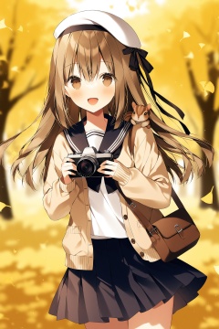 (masterpiece),(best quality),illustration,ultra detailed,hdr,Depth of field,(colorful),Artist weri,1girl,skirt,holding,smile,long hair,solo,bangs,hat,brown eyes,pleated skirt,camera,holding camera,long sleeves,school uniform,:d,black skirt,sailor collar,looking at viewer,serafuku,squirrel,blush,open mouth,bag,animal,beret,leaf,open clothes,shirt,autumn leaves,blurry,white shirt,brown hair,animal on shoulder,white headwear,ribbon,black bow,hair ribbon,black ribbon,blurry background,hair between eyes,bow,outdoors,cardigan,ginkgo leaf,autumn,puffy long sleeves,off shoulder,black sailor collar,cowboy shot,depth of field,open cardigan,standing,shoulder bag,