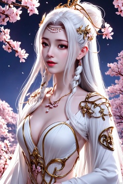 国漫风格, 白色长发, 金色发饰, 樱花, 复杂背景