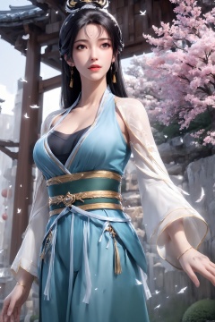 国漫风格, (upper body:1.4),dynamic poses, stunning colors, 3D rendering, masterpiece,high resolution,1girl,hanfu, Chinese Traditional cloth,ultra-detailed, (high detailed skin),glossy skin, female focus, chinese ink painting style,Wearing clothes with Chinese elements,(chinese style:1.2),extreme detailed,gufeng, gradient, fractal art, colorful, highest detailed hair,HDR,8kresolution,1girl,solo, chest pleated skirt, mature female, (wide hips), collarbone ,long hair,makeup,jewelry,eyeshadow, braid, looking at viewer, bangs, ,earrings,curtain,long sleeves, tassel, gold trim, (hair ribbon, headband, side braid) ,scenery,chinese architecture, trees, birds, sun,outdoors,depth of field,light particles, light rays, (floating hair, rock, bloom, bloom effect, random patterns, bold colors, dynamic texture, spontaneous creativity:1.2), athletic,complex artistic composition