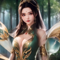 <lora:715-DA-师兄啊师兄-龙吉:0.8>(,1girl, ,best quality, ),looking at viewer,  ,ultra detailed background,ultra detailed background,ultra realistic 8k cg,(masterpiece:1.2),(best quality:1.2),(ultra detailed:1.2),(official art:1.3),(beauty and aesthetics:0.8),detailed,(intricate:0.8),(highly detailed),(solo),delicate countenance,1girl,fancy,(glassy texture:1.2),(crush:1.2),8k,accessory,tattoo,(transparent:1.1),gown,energy encirclement,instant,in the twinkling of an eye,upper body,woman in a mythical forest, masterpiece, perfect face, intricate details, horror theme, raw photo, photo unp(cleavage),,