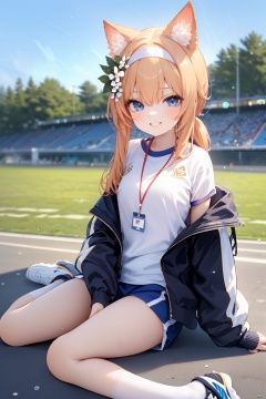 nai3, 11girl,solo,(masterpiece:1.3),( beautiful:1.2),(high quality:1.2),(finely detailed:1.2),extremely detailed CG unity 8k wallpaper,best quality,a very delicate and beautiful,perfect fingers,(one cute girl at the center:1.2),1girl, solo, long hair, looking at viewer, blush, smile, bangs, blue eyes, blonde hair, shirt, hair ornament, animal ears, hair between eyes, sitting, jacket, white shirt, ponytail, flower, thighs, hairband, outdoors, open clothes, shoes, shorts, socks, hair flower, off shoulder, black footwear, orange hair, grin, blurry, open jacket, official alternate costume, black jacket, animal ear fluff, kneehighs, blurry background, halo, white flower, white socks, sneakers, between legs, gym uniform, knee up, track jacket, hand between legs, white hairband, id card, multicolored jacket, two-tone jacket, mari \(blue archive\),mariBA,mariGym