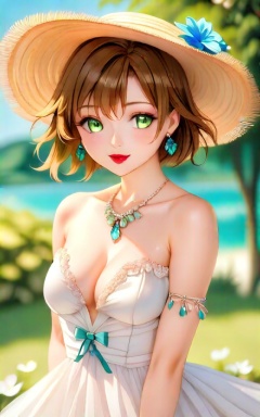 1girl, solo, breasts, looking at viewer, blush, short hair, brown hair, dress, hat, bow, cleavage, jewelry, bare shoulders, medium breasts, green eyes, collarbone, flower, outdoors, earrings, parted lips, sleeveless, day, white dress, bare arms, blue bow, hat bow, sun hat