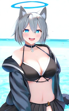 1girl, solo, breasts, looking at viewer, smile, blue eyes, large breasts, hair ornament, animal ears, closed mouth, cleavage, jacket, collarbone, swimsuit, grey hair, bikini, choker, black skirt, open jacket, halo, animal ear fluff, covered navel, black bikini, wolf ears, extra ears, stud earrings, shiroko (blue archive)
