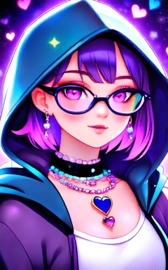 1girl, solo, looking at viewer, hat, jewelry, purple eyes, purple hair, heart, earrings, choker, glasses, hood, heart earrings