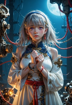 1girl,solo,looking at viewer,medium hair,bangs,hairband,purple eyes,hair ornament,hair between eyes,white hair,fluffy hair,large_breasts,blush shy,shiny_skin,very detailed clothes,very realistic textures,very detailed textures,longeyelashes,brown eye shadow,night,dim light,cyberpunk,mechanical arm,sci-fi style clothes,hair_tucking,metal material,realistic metallic texture,hands,raise your hand,Injuries,scratches,gears,links,chains,wires,sparks,electric sparks,crying,tears,1girl,large_breasts,Gray hair,air bangs,very long hair,thick hair,fluffy hair,Chinese clothing,very long dresses,hair accessories,hairpins,loose sleeves,long sleeves,bracelets,earrings,Hanfu,fine costumes,fine textures,girl standing beside the peach tree in a daze,flapping her hair,light yarn,translucent,, score_9,score_8_up,score_7_up,masterpiece,best quality,8k,